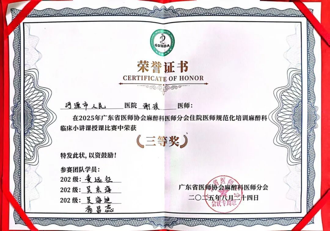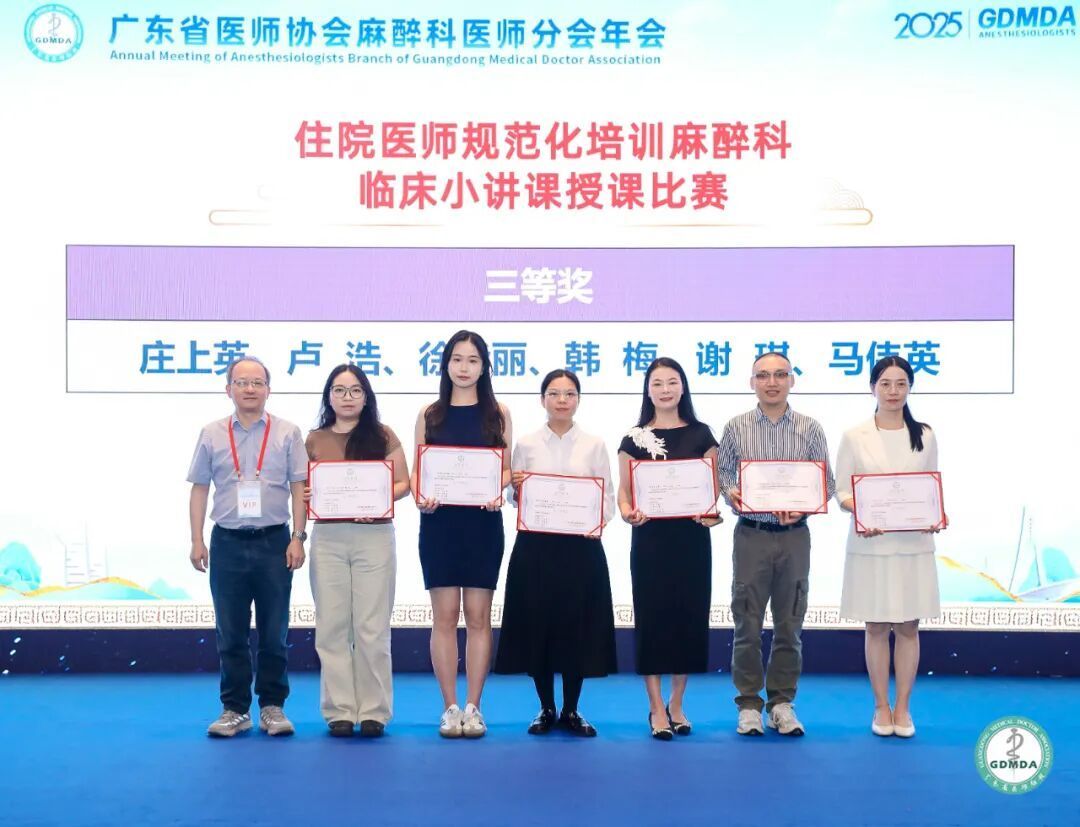 近日,2025年广东省大夫协会麻醉科大夫分会年会传来捷报,我院麻醉科基地的谢琪主治大夫团队荣获2025广东省麻醉专科指点大夫临床小讲课教诲才调大赛三等奖。同期,麻醉科基地书记戴舟师主治大夫也指导住培学员们在麻醉危急资源料理责任坊比赛中展现了讲究的团队合营与济急料理才调,得回了在场评委及同业的好评。